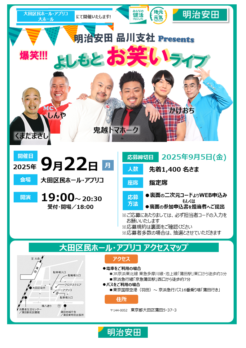 この度、明治安田 品川支社では、大田区民ホール・アプリコ 大ホールにて「爆笑!!!よしもと お笑いライブ」を開催いたします。